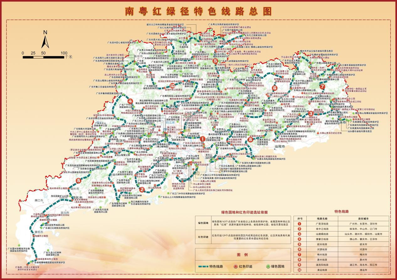 “南粤红绿径”由“绿色园地”和“红色印迹”两部分组成,“绿色园地”的162个点选自广东省级以上各类自然保护地、省属国有林场以及具有“红绿”资源丰富的市级国有林场;“红色印迹”129个点则选自绿色园区内或周边的红色资源,以及其他具有代表性重要的红色革命遗址和纪念地。