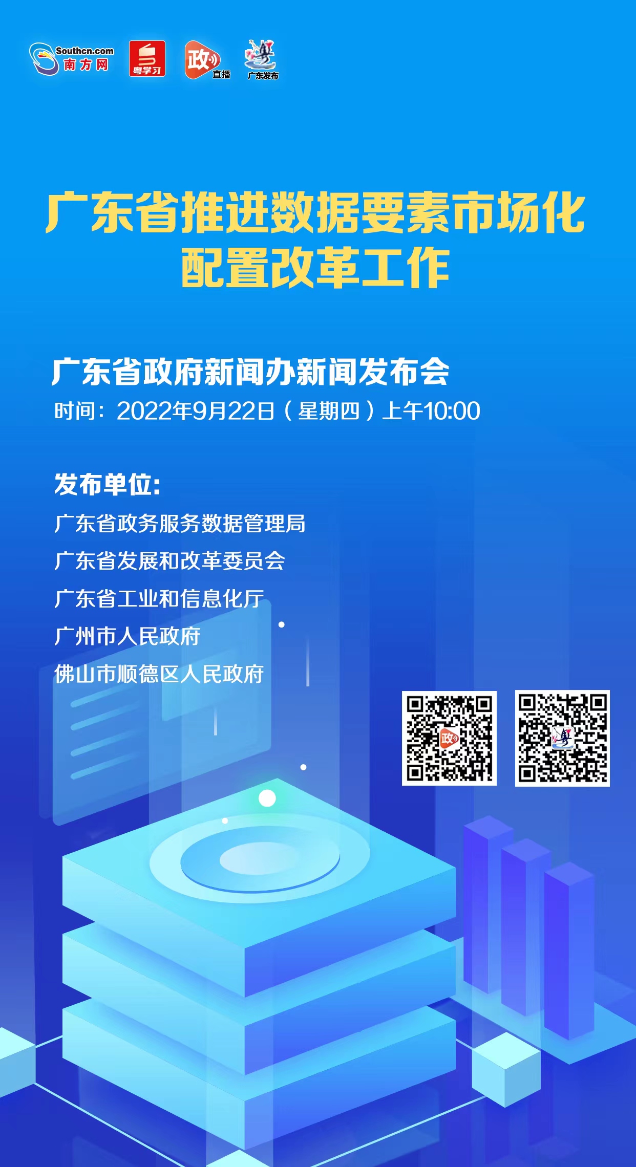 广东省人民政府365报价官网_365bet足球即时比分网_365平台被黑办公室将于 2022年9月22日(星期四)上午10时在广东大厦三楼国际会议厅,举行广东省推进数据要素市场化配置改革工作365报价官网_365bet足球即时比分网_365平台被黑发布会,由省政务服务数据管理局主要负责同志作主发布,省发展改革委、省工业和信息化厅,广州市、佛山市顺德区有关负责同志出席并回答记者提问。