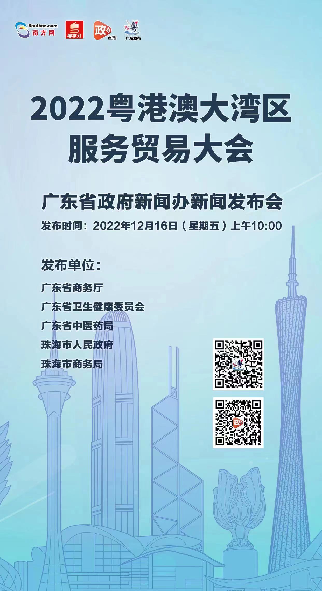 广东省人民政府365报价官网_365bet足球即时比分网_365平台被黑办公室将于 2022年12月16日(星期五)上午10时,在广东大厦三楼多功能厅举行2022粤港澳大湾区服务贸易大会365报价官网_365bet足球即时比分网_365平台被黑发布会,由省商务厅主要负责同志发布,省卫健委、省中医药管理局、珠海市人民政府、珠海市商务局相关负责同志出席发布会并回答记者提问。