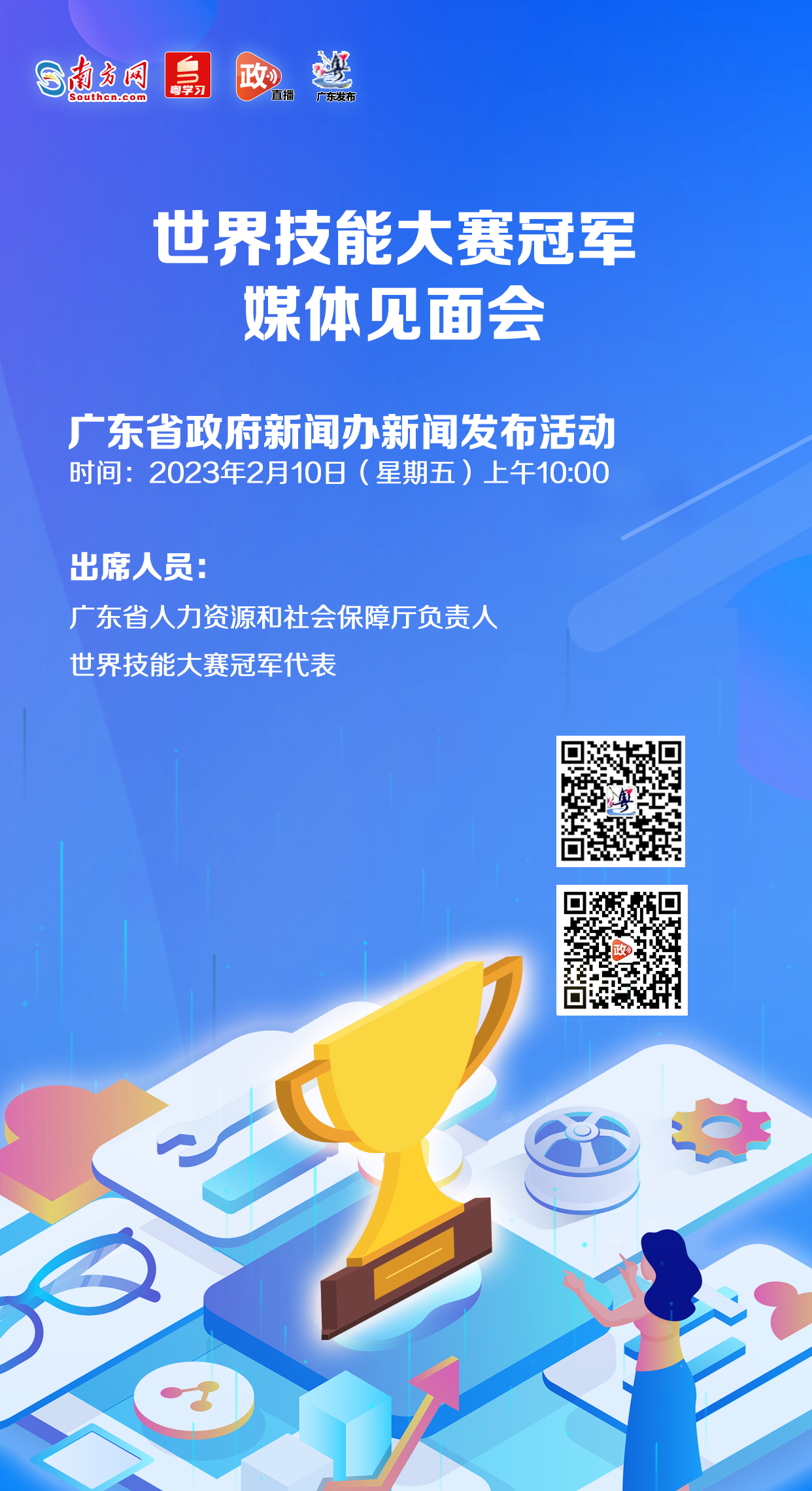 广东省人民政府365报价官网_365bet足球即时比分网_365平台被黑办公室将于 2023年2月10日(星期五)上午10时,在粤港澳大湾区(广东)人才港(广州市越秀区东风中路389号)6楼会议室举行世界技能大赛冠军媒体见面会,由省人社厅党组成员、副厅长、一级巡视员杨红山,世界技能大赛数控铣项目金牌获得者周楚杰、电子技术项目金牌获得者刘泽龙、移动应用开发项目金牌获得者杨书明、云计算项目金牌获得者陈新源出席见面会并回答记者提问。