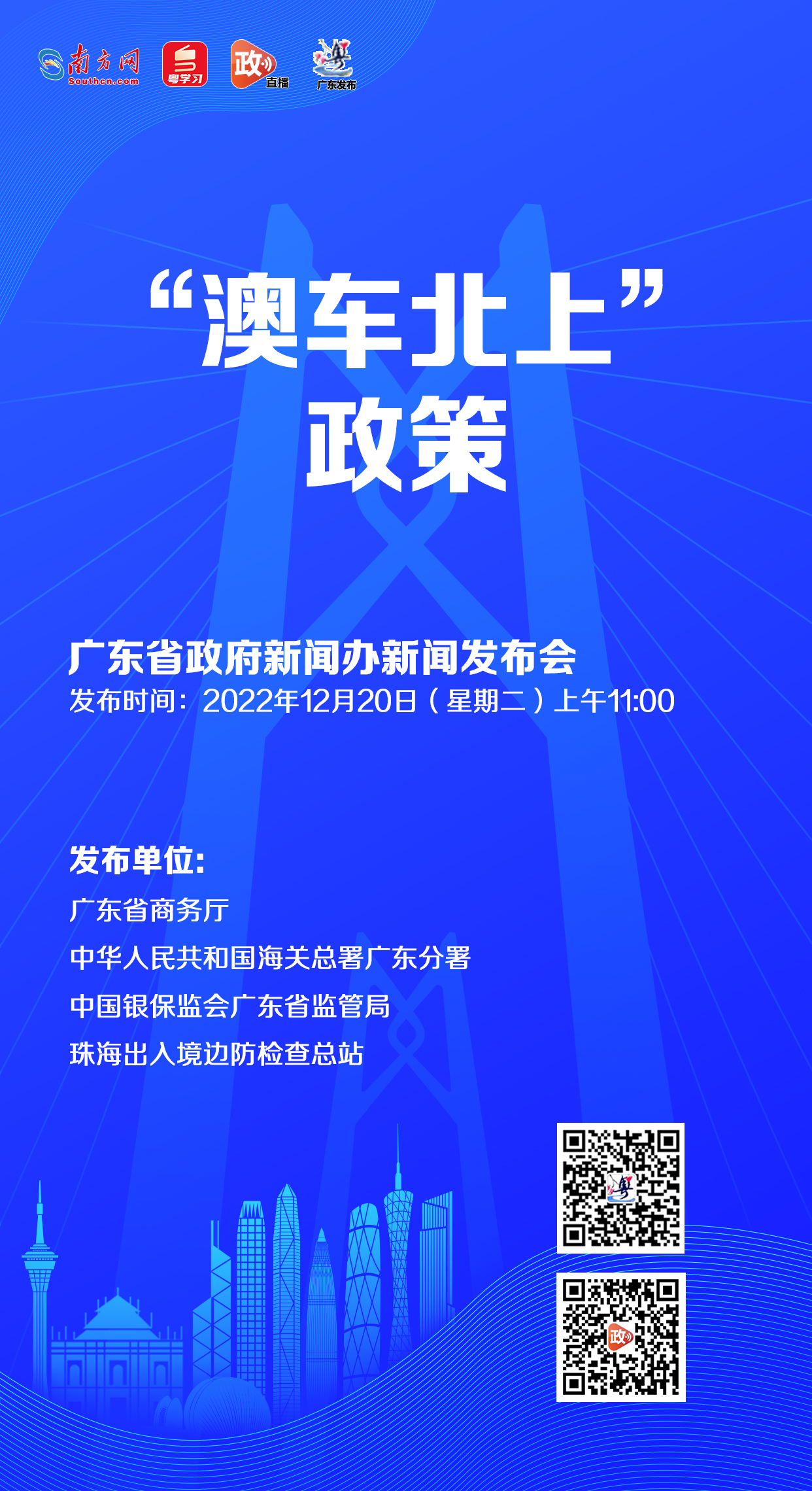 广东省人民政府365报价官网_365bet足球即时比分网_365平台被黑办公室将于 2022年12月20日(星期二)上午11时,在广东大厦三楼国际会议厅举行“澳车北上”政策365报价官网_365bet足球即时比分网_365平台被黑发布会,由广东省公安厅负责同志发布,广东省商务厅、海关总署广东分署、广东银保监局、珠海边检总站相关负责人出席发布会并回答记者提问。南方网、粤学习客户端全程直播,敬请关注。
