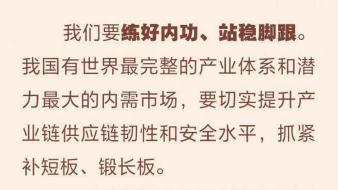 2月16日出版的第4期《求是》杂志发表中共中央总书记、国家主席、中央军委主席习近平2022年12月15日在中央经济工作会议上重要讲话的一部分《当前经济工作的几个重大问题》。围绕“加快建设现代化产业体系”,讲话指出“我们要练好内功、站稳脚跟”。